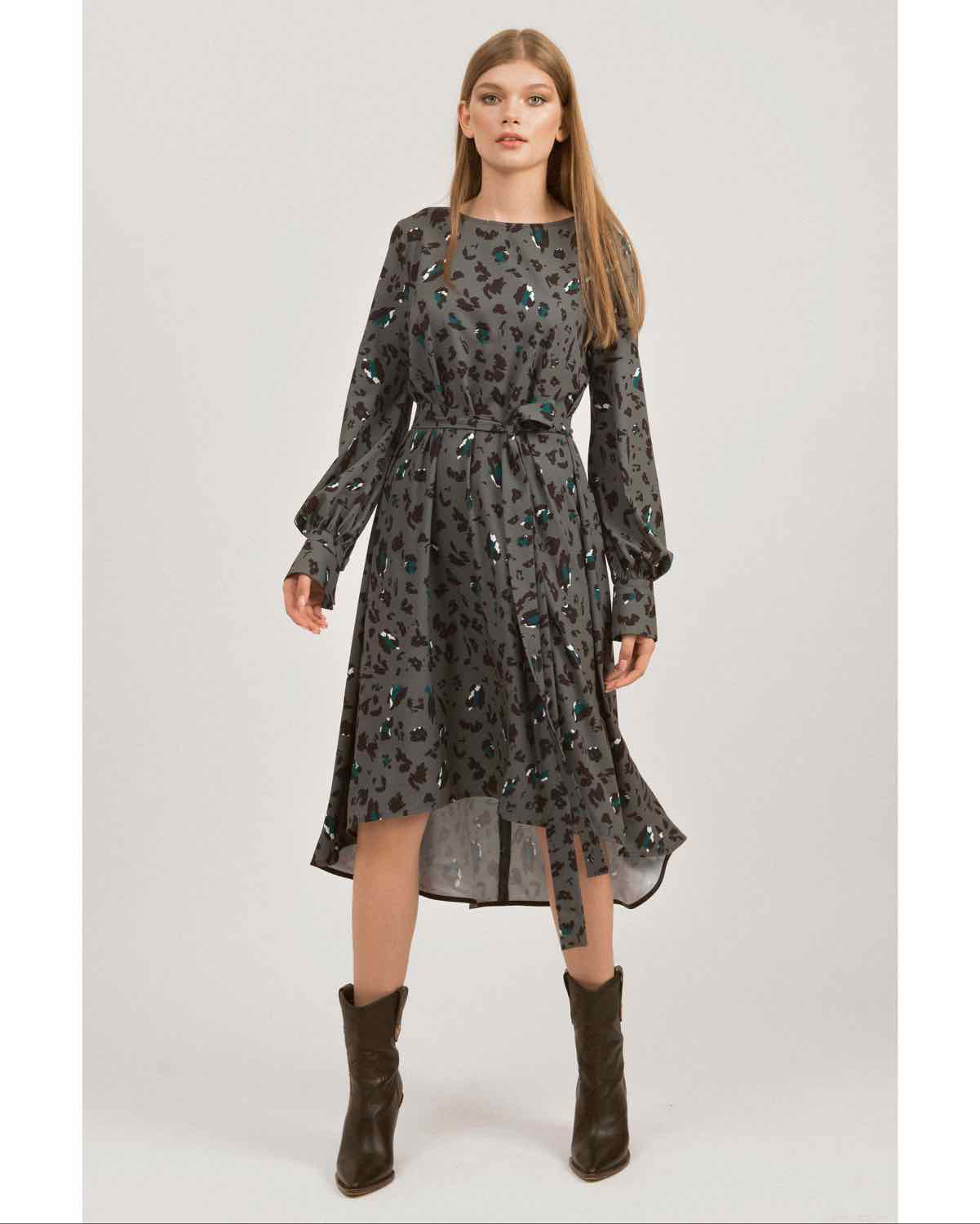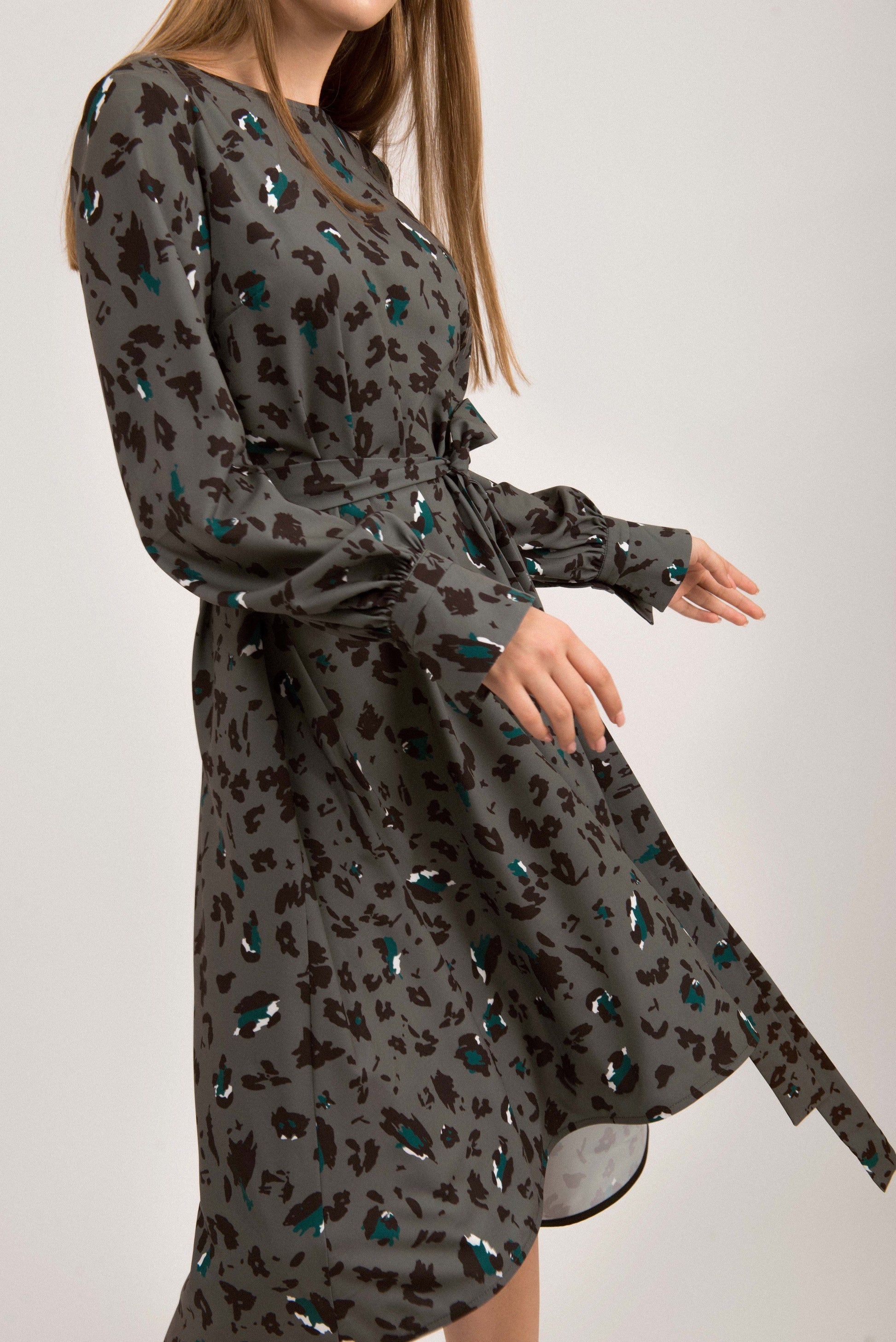 Long sleeves dress of a medium length. It has fabric belt that highlights the shape of the body and unusual cascade cut.
