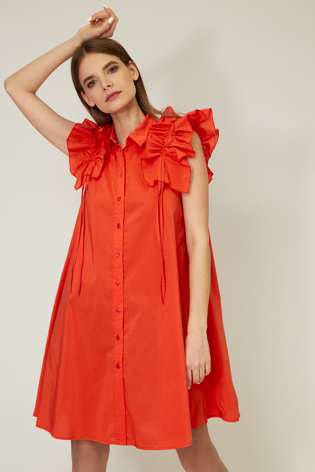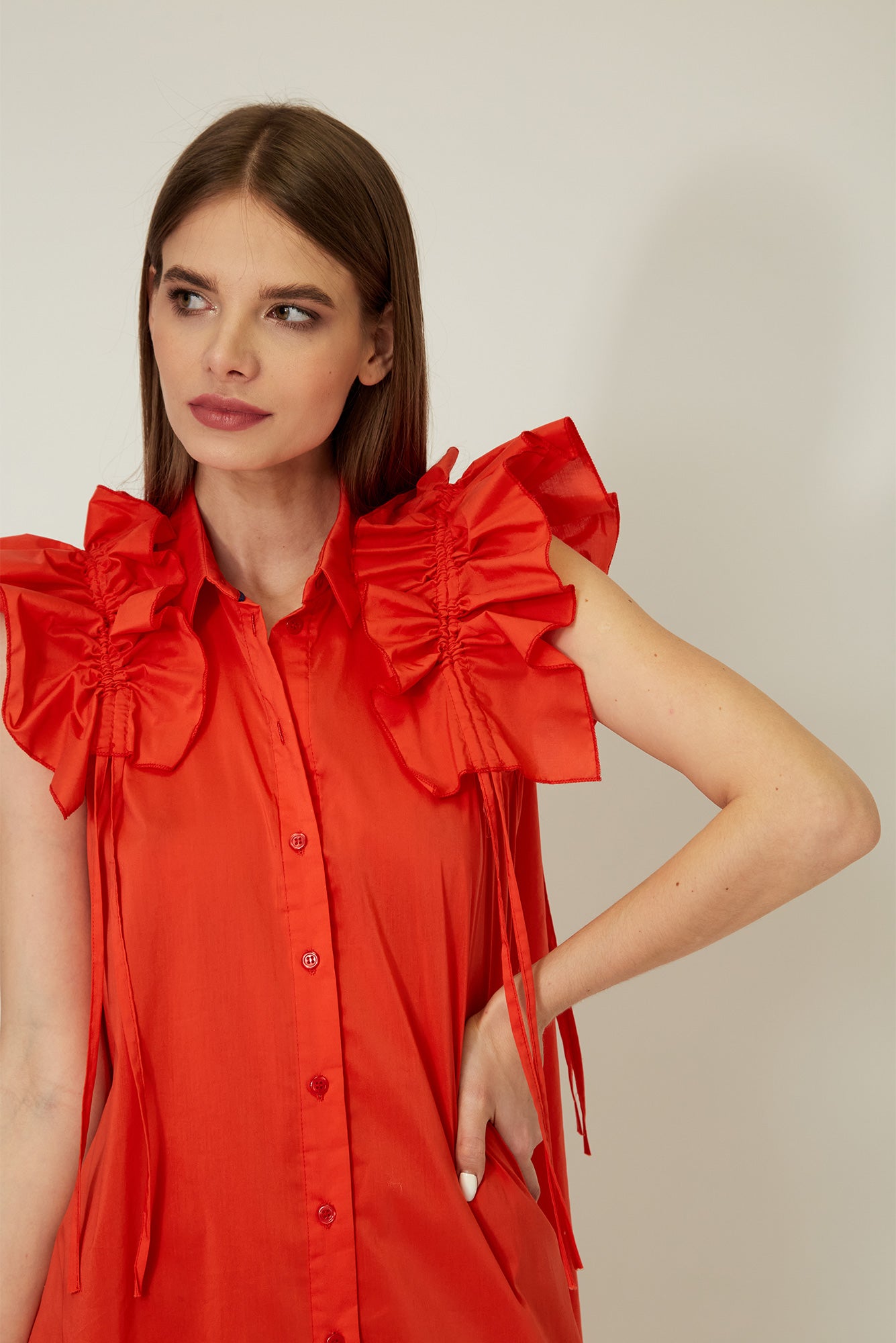 On the shoulders there are removable pads with ruffles and laces for extra volume.