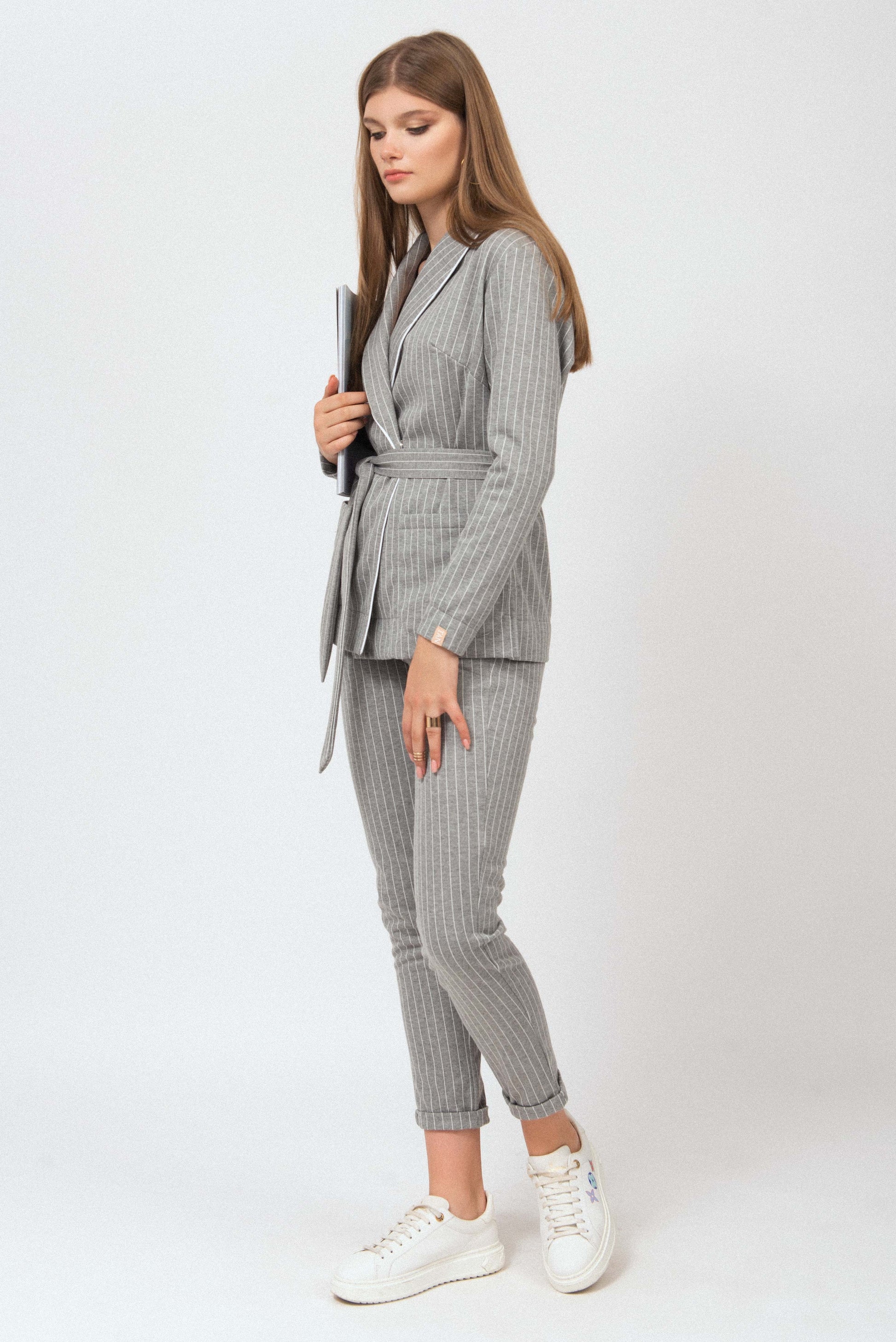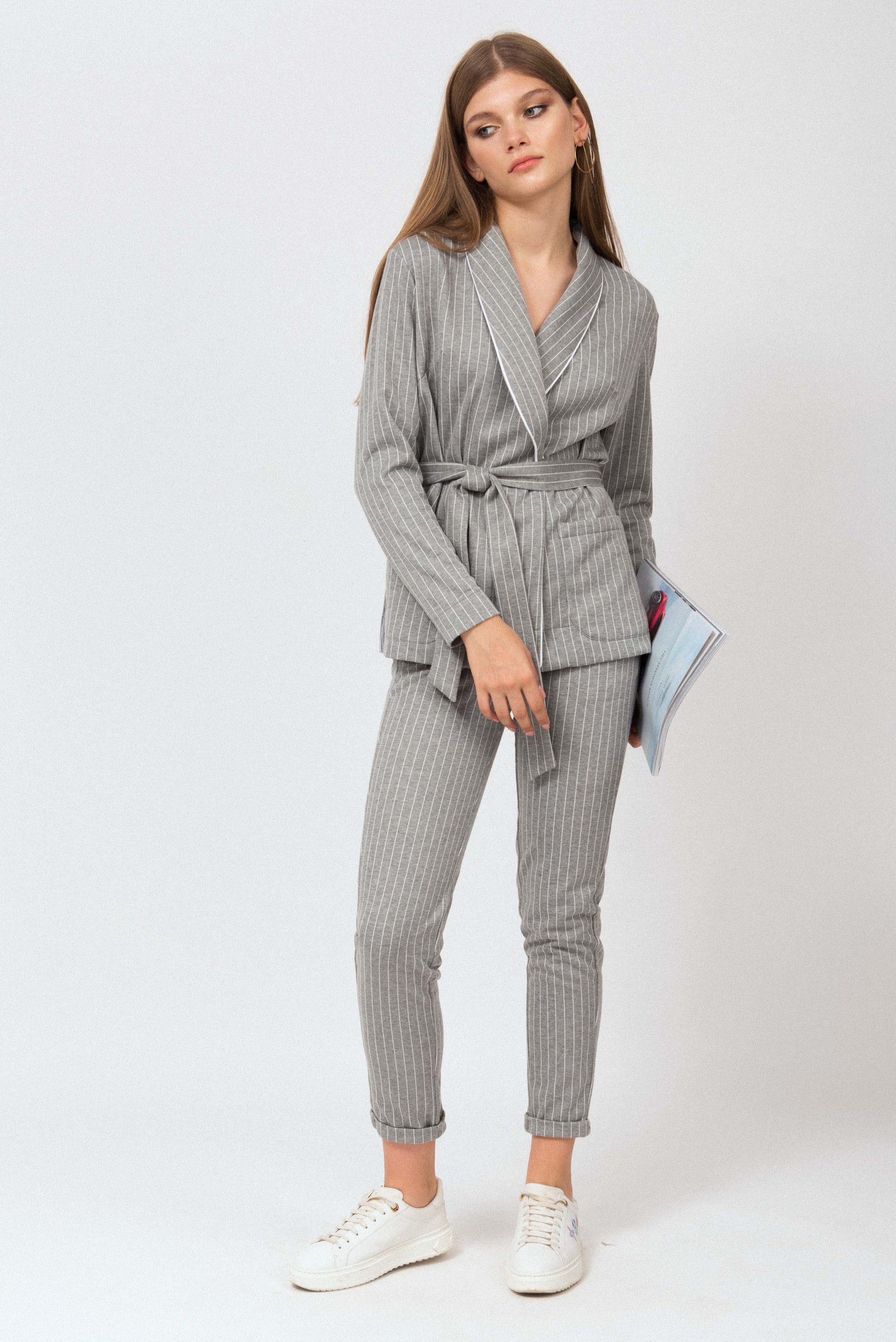 7/8 cropped trousers are fixed at the waist with an elastic band.