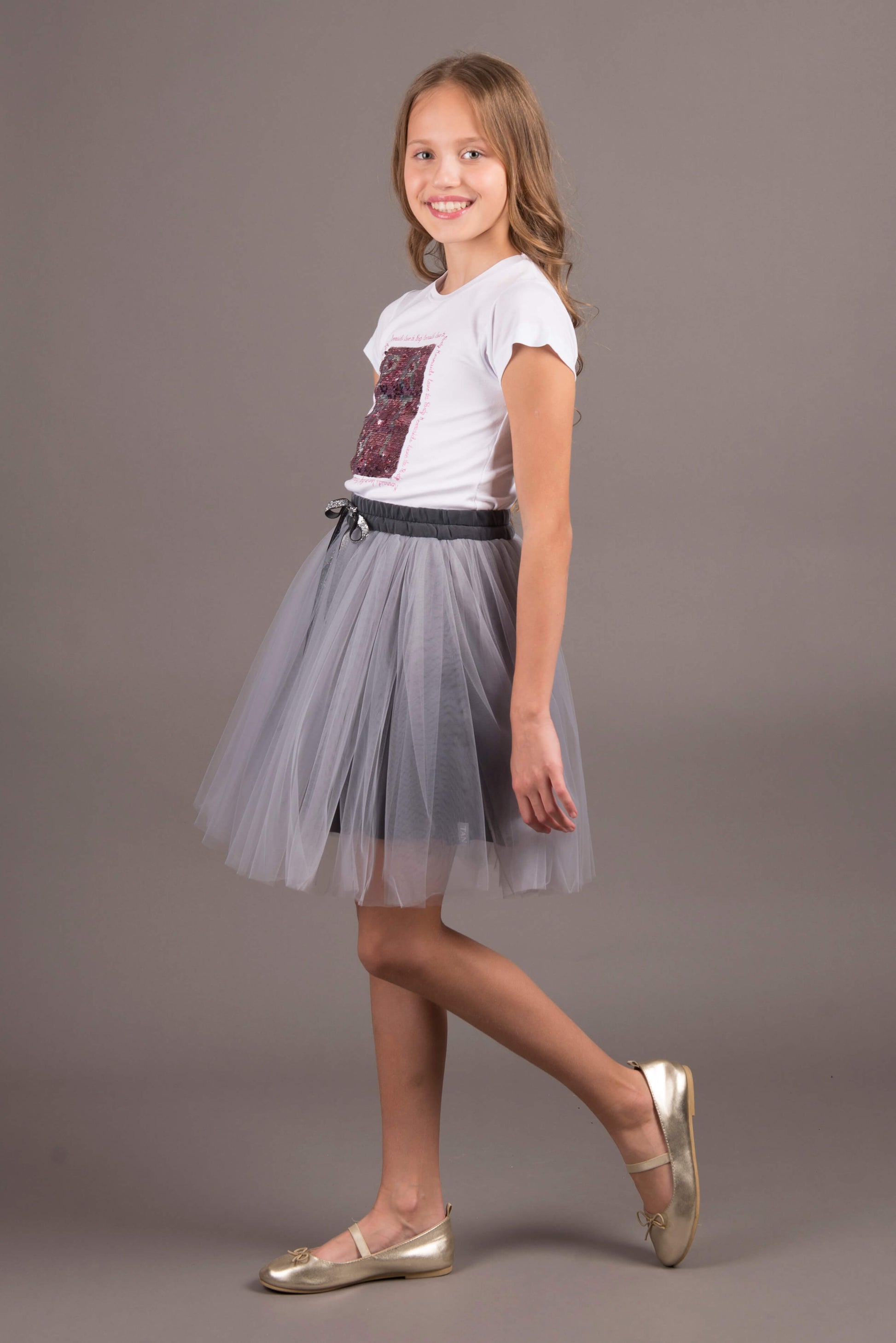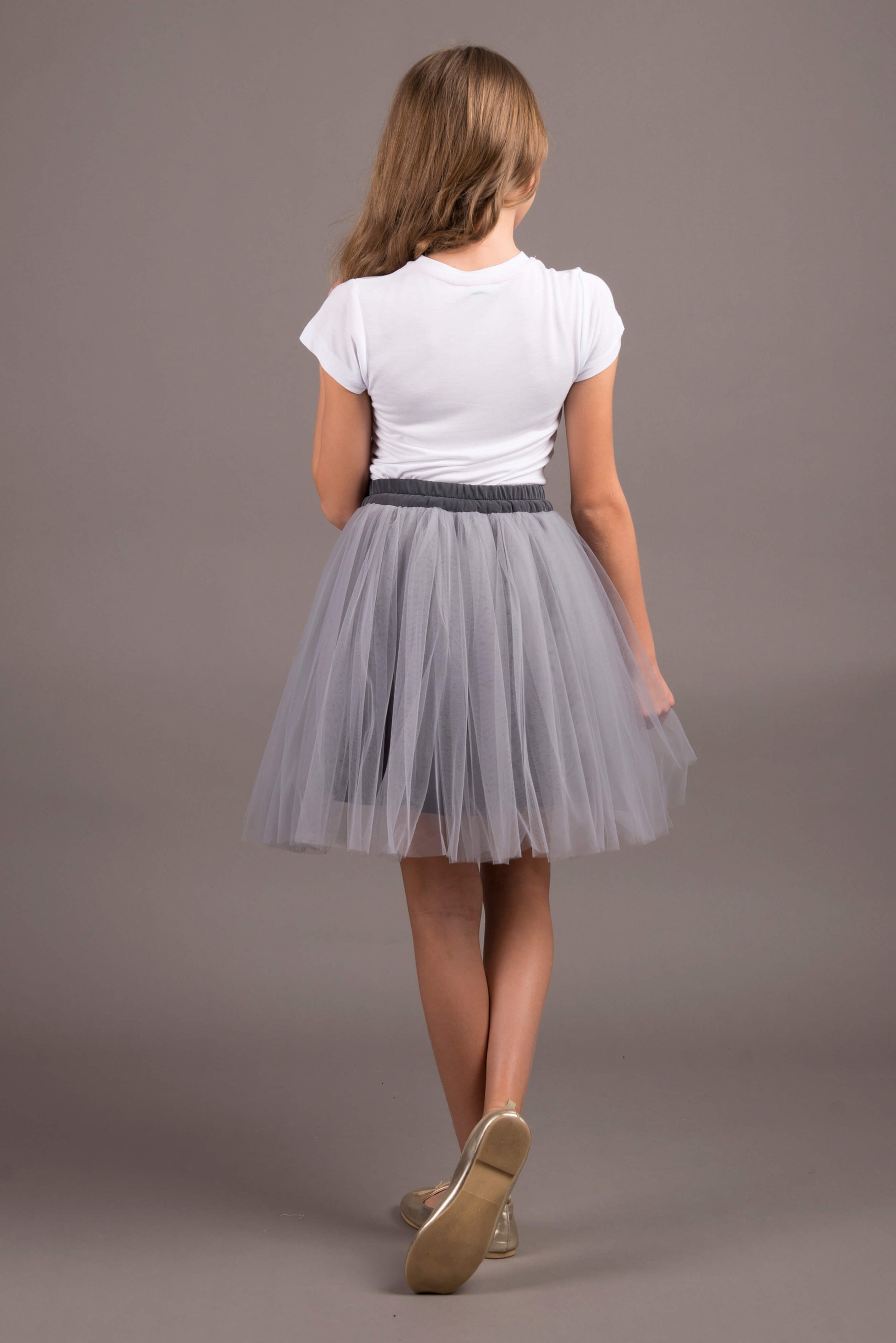 Fluffy tulle skirt with an elastic band for girls of medium length with a decorative