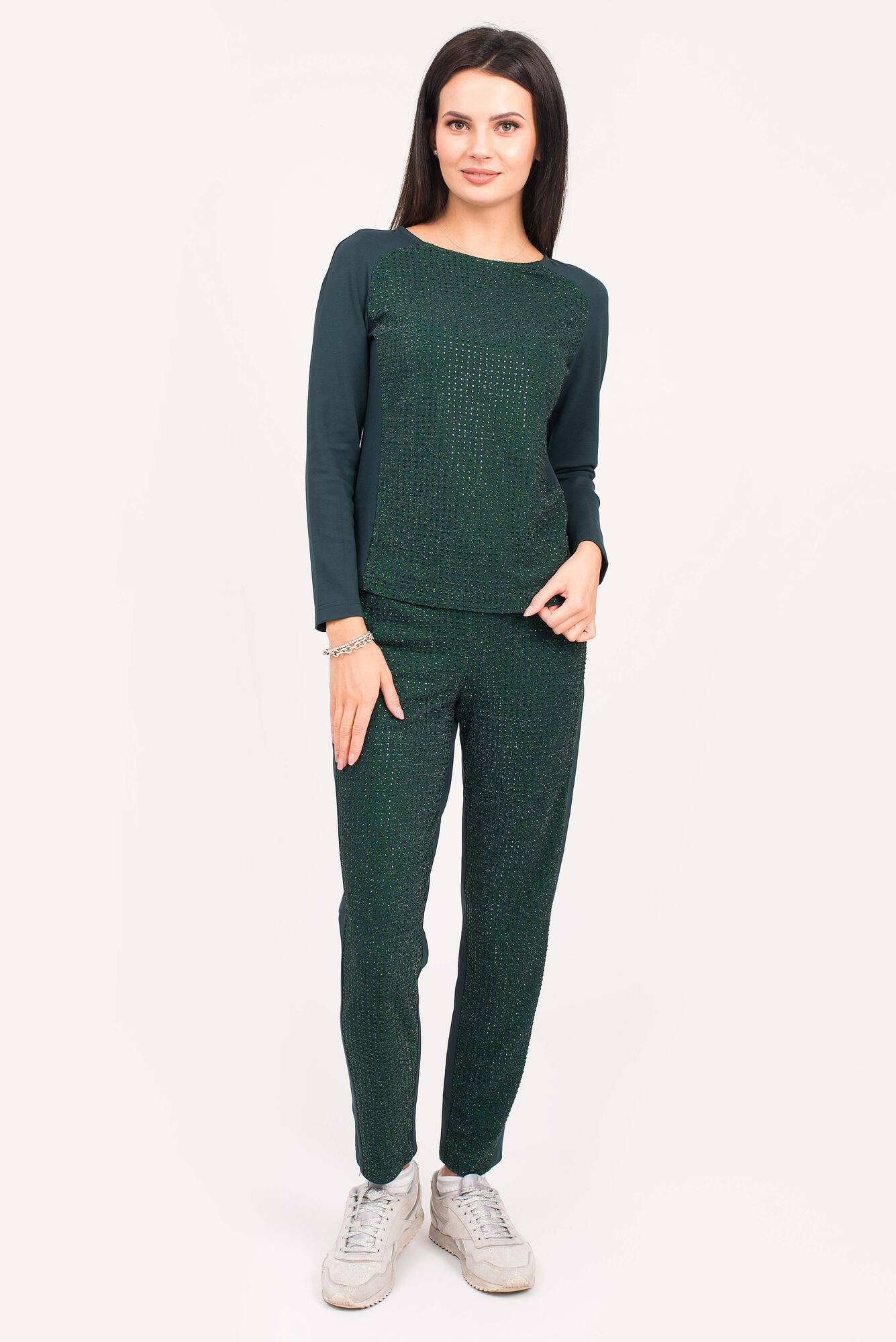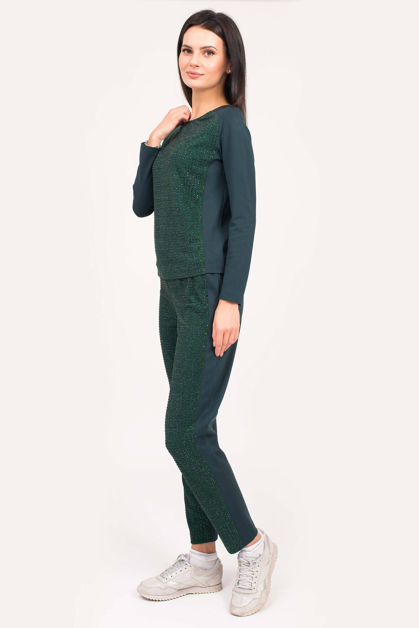 The front cut is decorated with shiny green hemispheres sewn in even lines.
