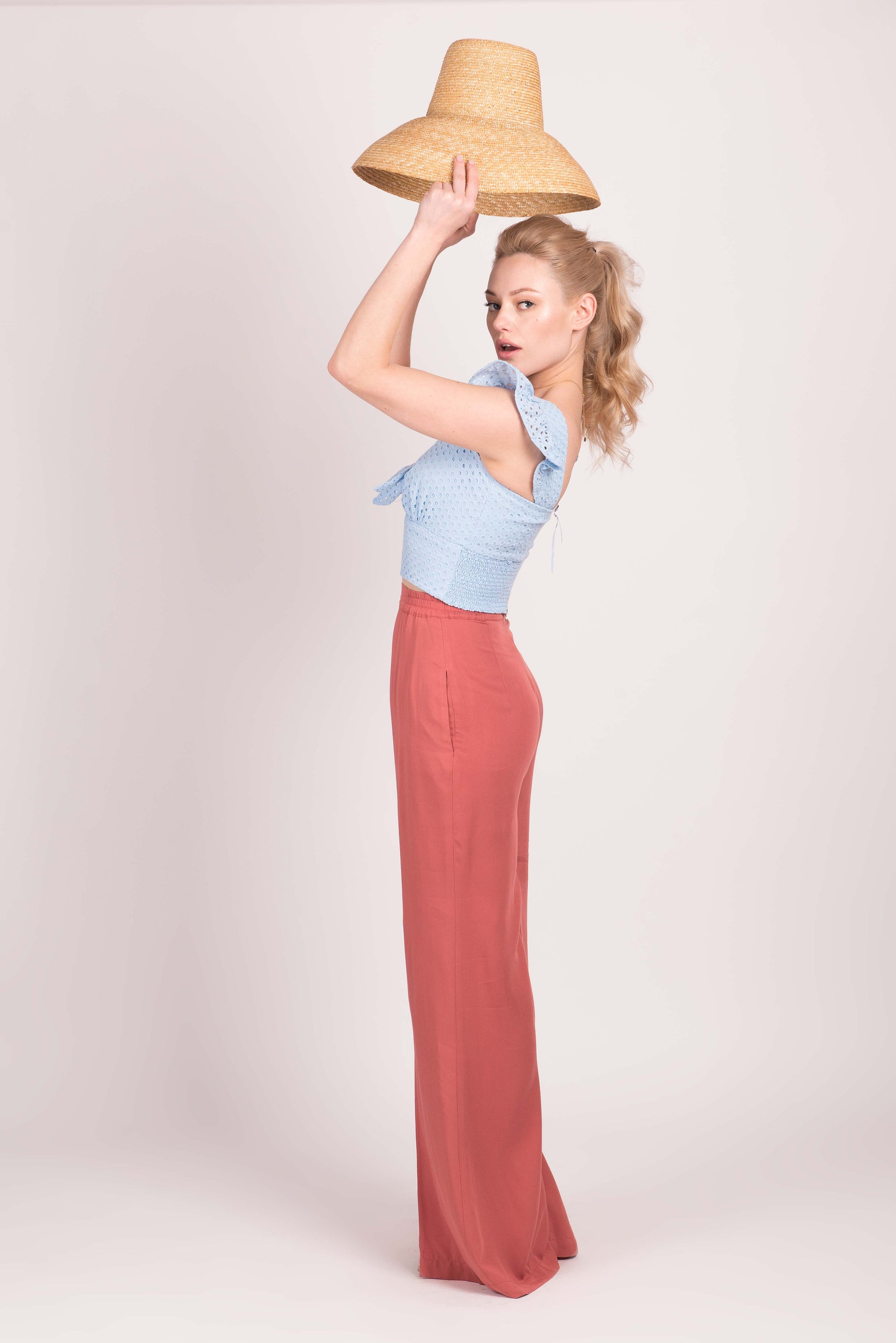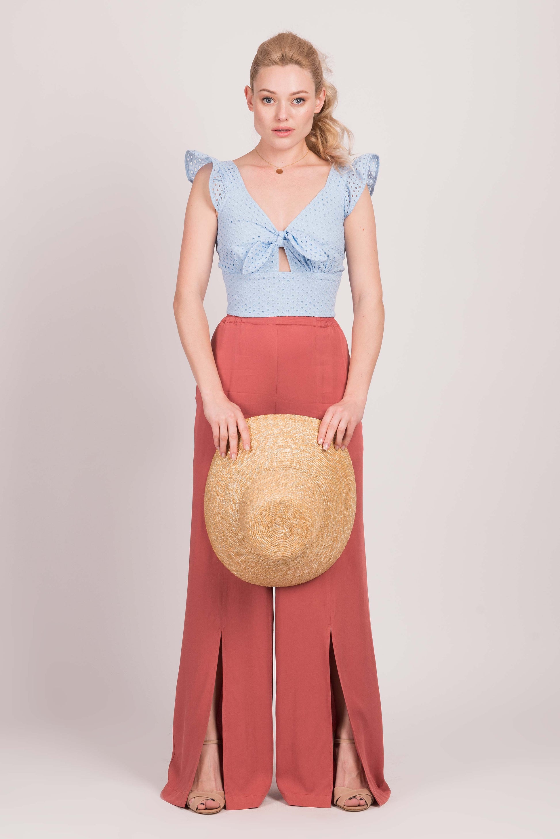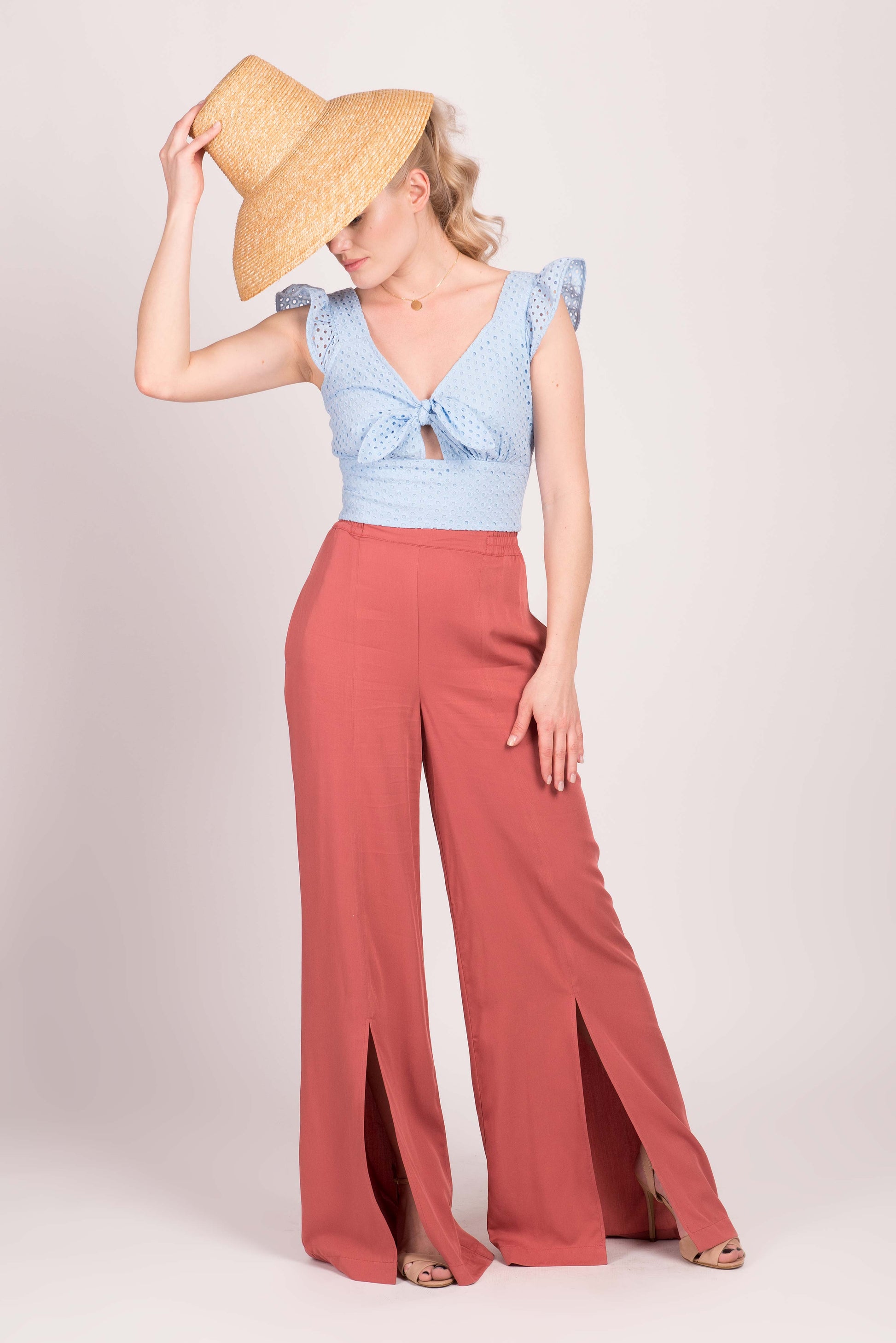Straight wide pants from the designer's summer collection - with arrows and spectacular cuts in the center of the front of the pants. Elastic waistband, zipper at the back and two pockets in the side seams. Nice light fabric.
